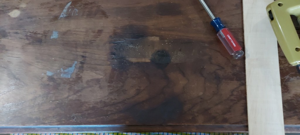 The other reason this seemed to be a good contender is that the middle of the top had some major veneer damage. It almost looked like there was a burn mark. But I didn’t need the middle, and I wouldn’t have to feel bad about cutting it out.