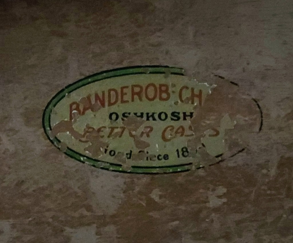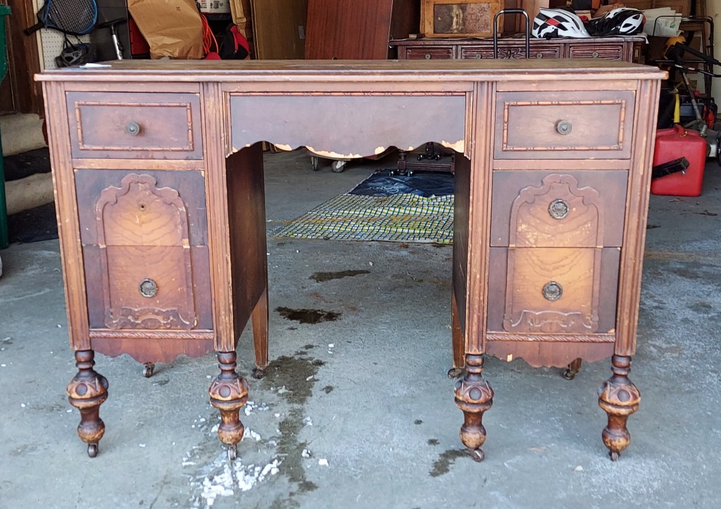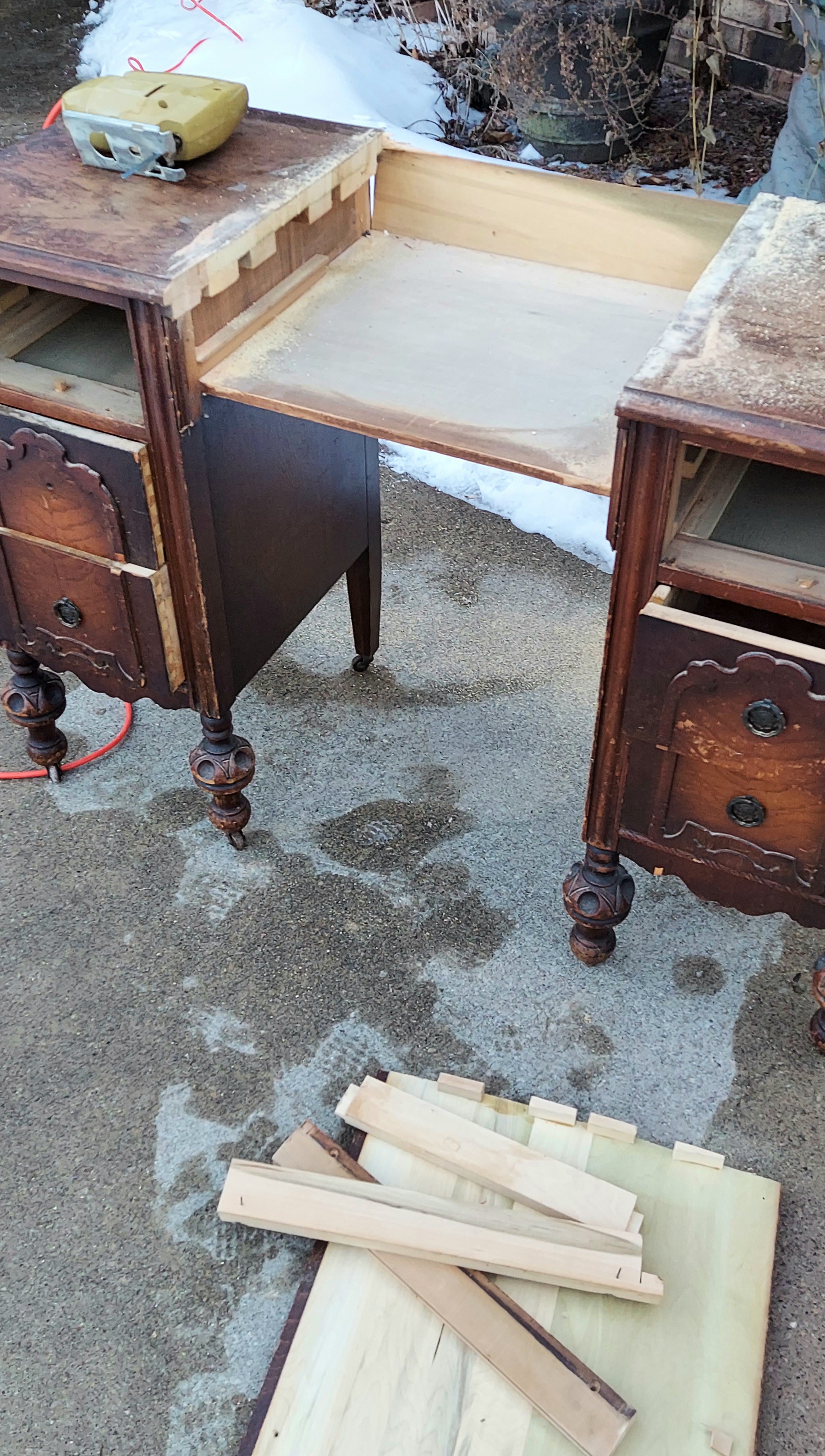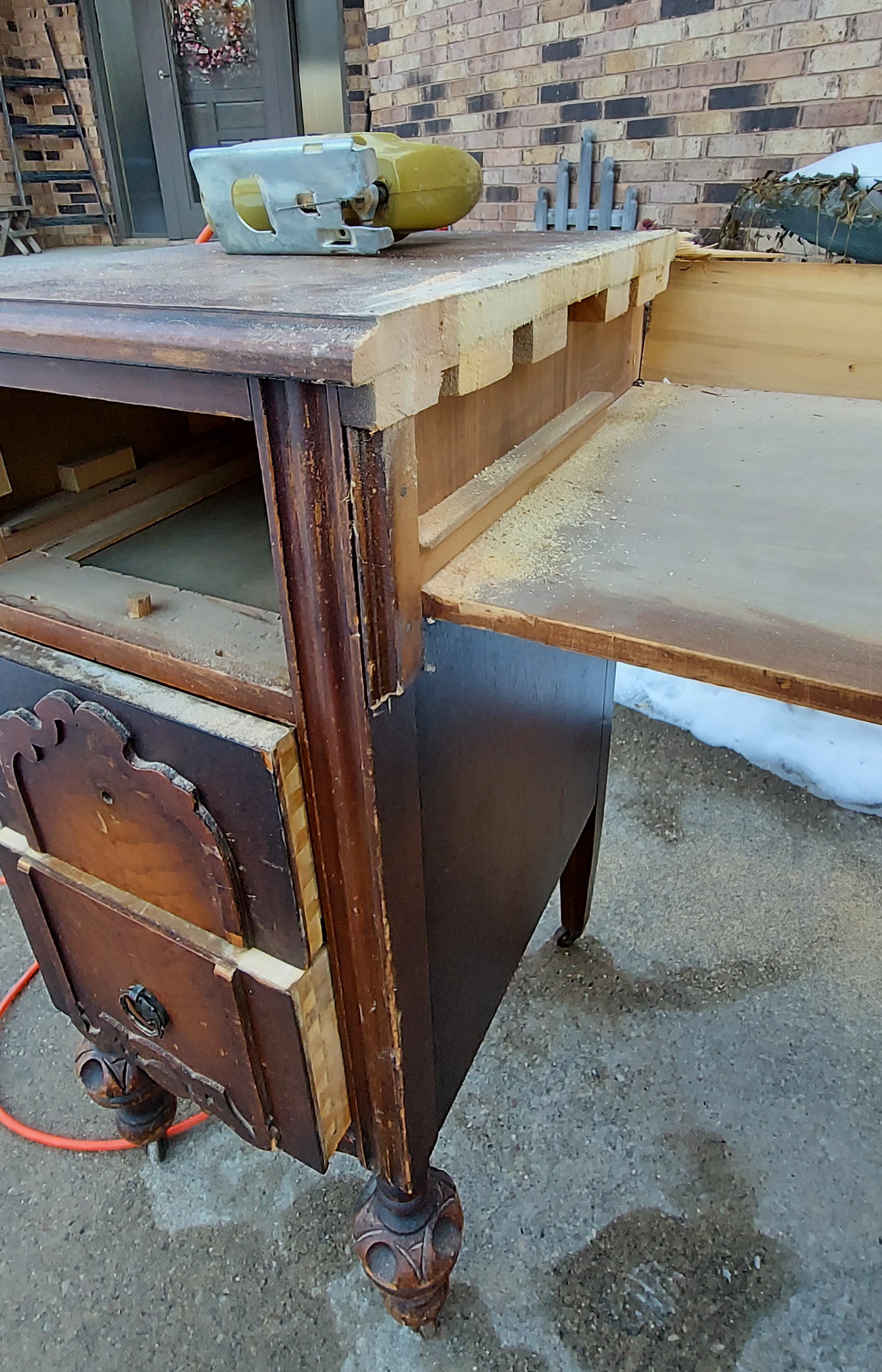Then, I basically just started cutting. Sometimes you just have to go for it. I knew the context of what I needed to remove. It was just a matter of how to do it. Once I cut as close to the interior as possible, I could see I still had some pieces to remove. A good old mallet worked for most of it, especially the pieces glued on as extra support. There were, however, some wood pieces notched inside, which the mallet still got out, but it left me with holes to fill. I kind of expected that. There were also a couple wood dowels, and my hubby helped pry those out. It was work, but still doable. I have to say this was a well-made desk! It originated with Banderob & Chase Furniture Company in Oshkosh, which happened to close in 1939, so you know this has history!