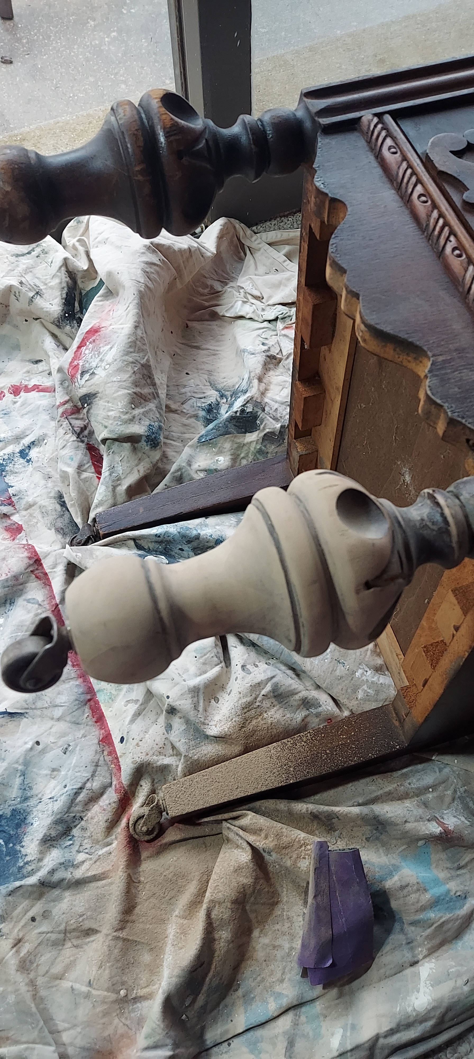 Now you know I love some beautiful natural wood, and I had my heart set on exposing these chunky legs. Instead of making it perfectly clean, I rather liked the rustic finish. So I left some of the stained areas to accentuate the carvings and complement the black painted finish. Hand-sanding takes patience and time, especially when you have 4 legs to expose!