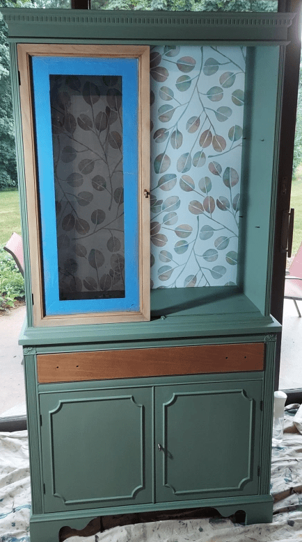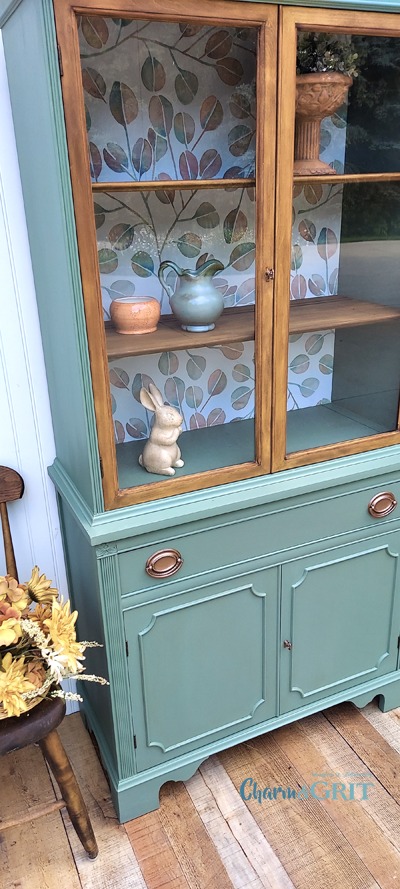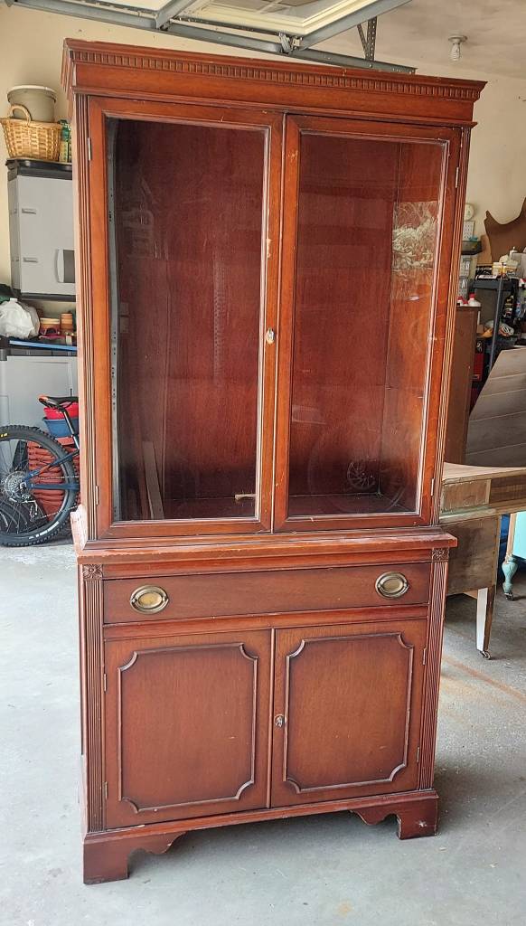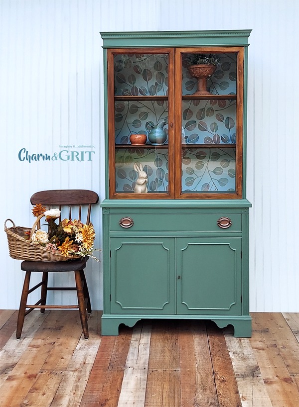 It didn’t have the curvy top or the fretwork in the windowed doors like the last one I redid, but it was the same petite size and linear shape. Here’s the BEFORE pic. It was in great condition.