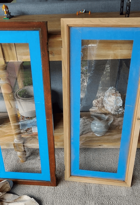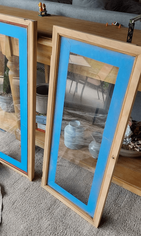 Before sanding the old finish from the frames, I applied painter’s tape on the glass. This would protect the glass from being scratched from my sandpaper. With such a small area, my best bet was to HAND SAND these.