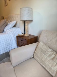 One of the best surprises was the chaise lounge chair we tucked into the corner. At $160, it was a gamble because of mixed reviews, but it’s become our favorite part of the room. The sunlight pours in there, and you can even hear the wind chimes drifting up from the patio below. Now it’s the perfect place to curl up with a book or simply sit and breathe — the ultimate cozy bedroom idea on a budget.