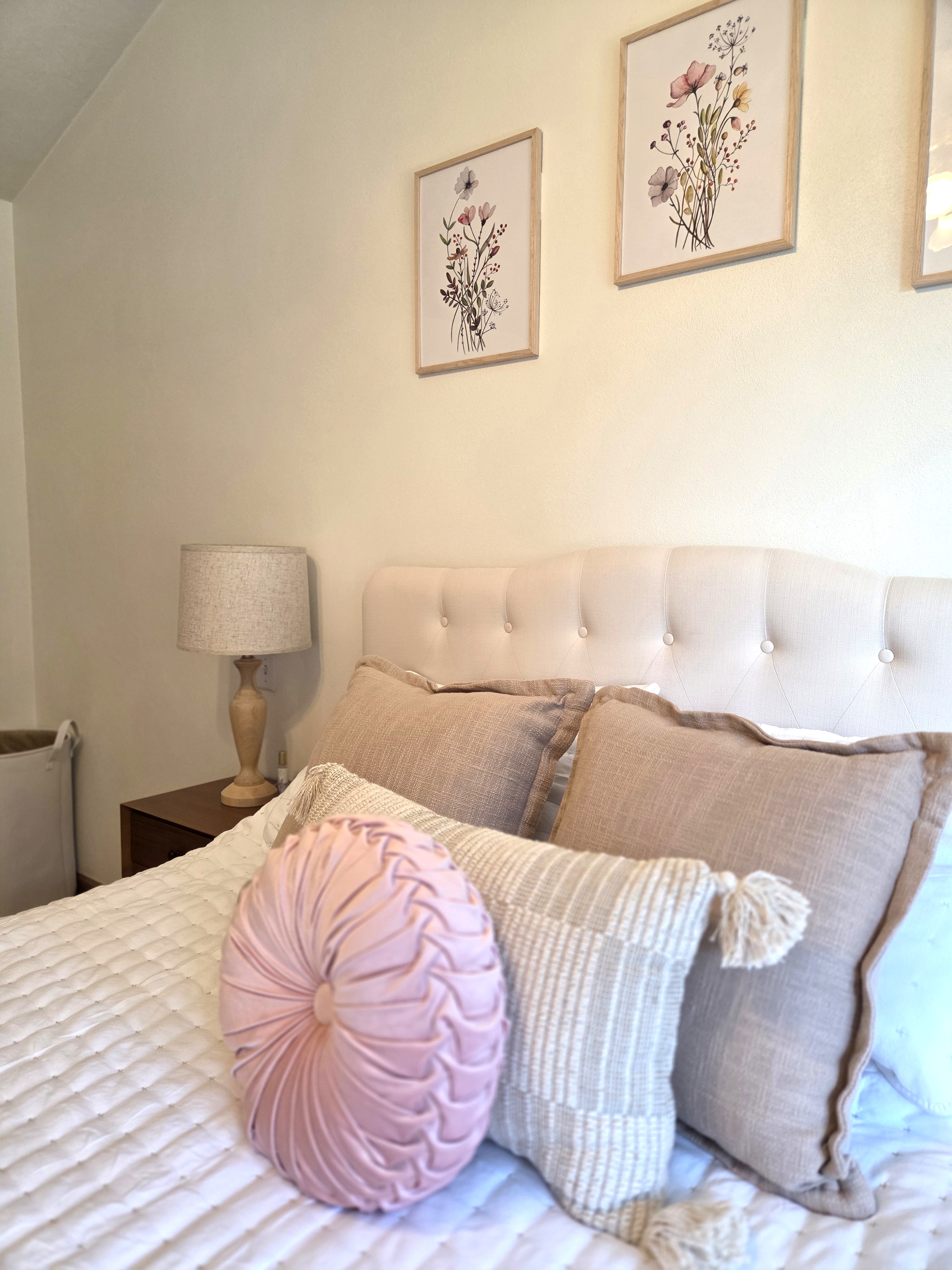 My friend’s bedroom was in desperate need of a refresh. The walls were tan, the bed felt lost without a headboard, and the space was so large that everything seemed to just float. She admitted she didn’t even know what her style was, which made it tricky to know where to start. At first she leaned toward more color, but after talking through options, she realized what she really wanted was a calm, neutral bedroom makeover with feminine touches of pink.