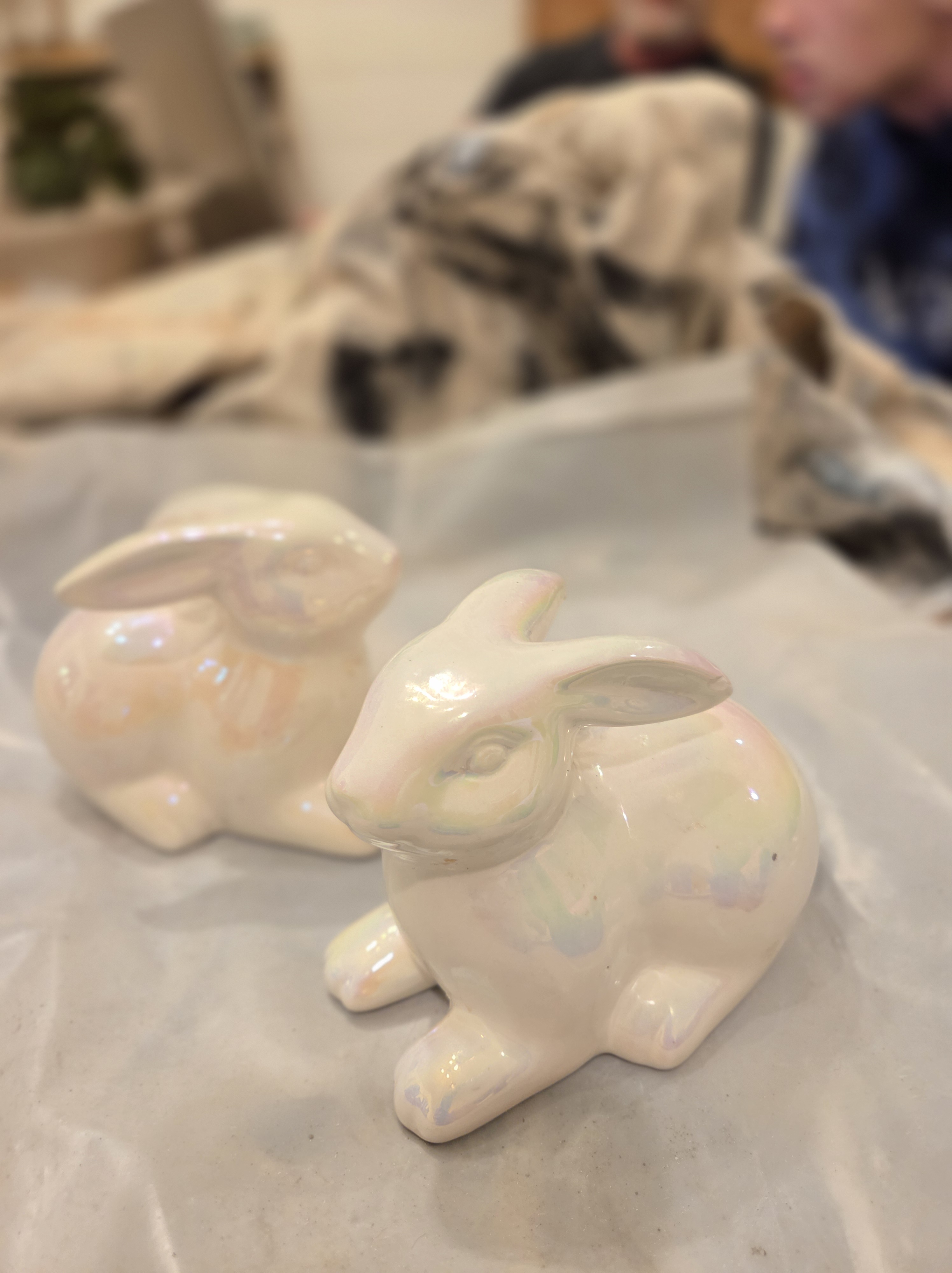 These shiny, iridescent bunnies had great form but felt more like Easter décor than timeless home accents. The solution was the same plaster-inspired finish I used on the larger bunny, but in a greenish gray color this time. The matte texture instantly made them feel grounded and natural, like little stone statues — no sparkle required.