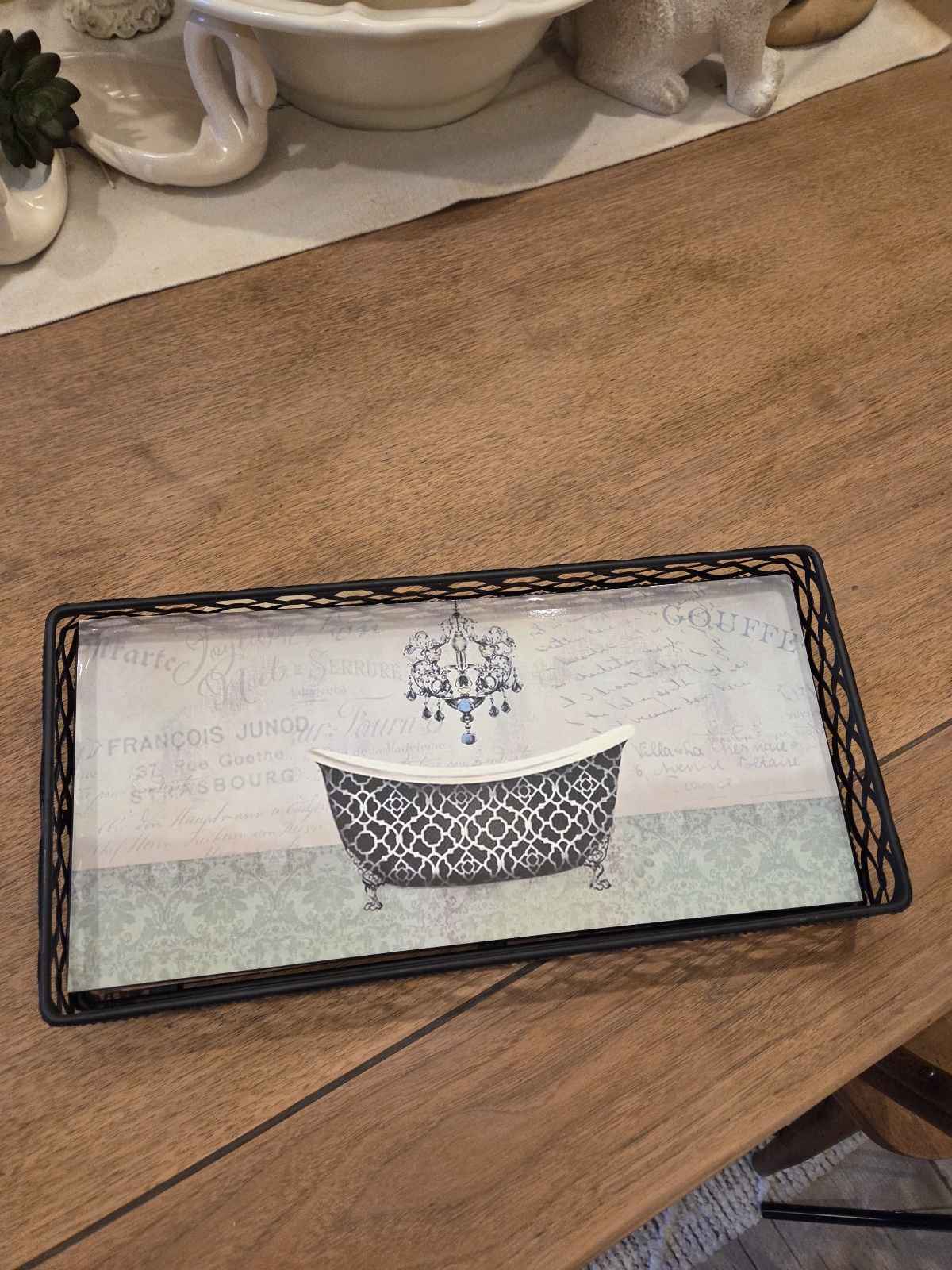 This black metal tray originally had a tin printed insert with a dated design. Instead of tossing the whole tray, I swapped the insert for a real piece of wood, then added a painted black inlay by Iron Orchid Designs for a vintage-inspired cottage feel. Now it’s the kind of tray you’d want to keep out on display — layered with a pitcher of flowers or a stack of books.