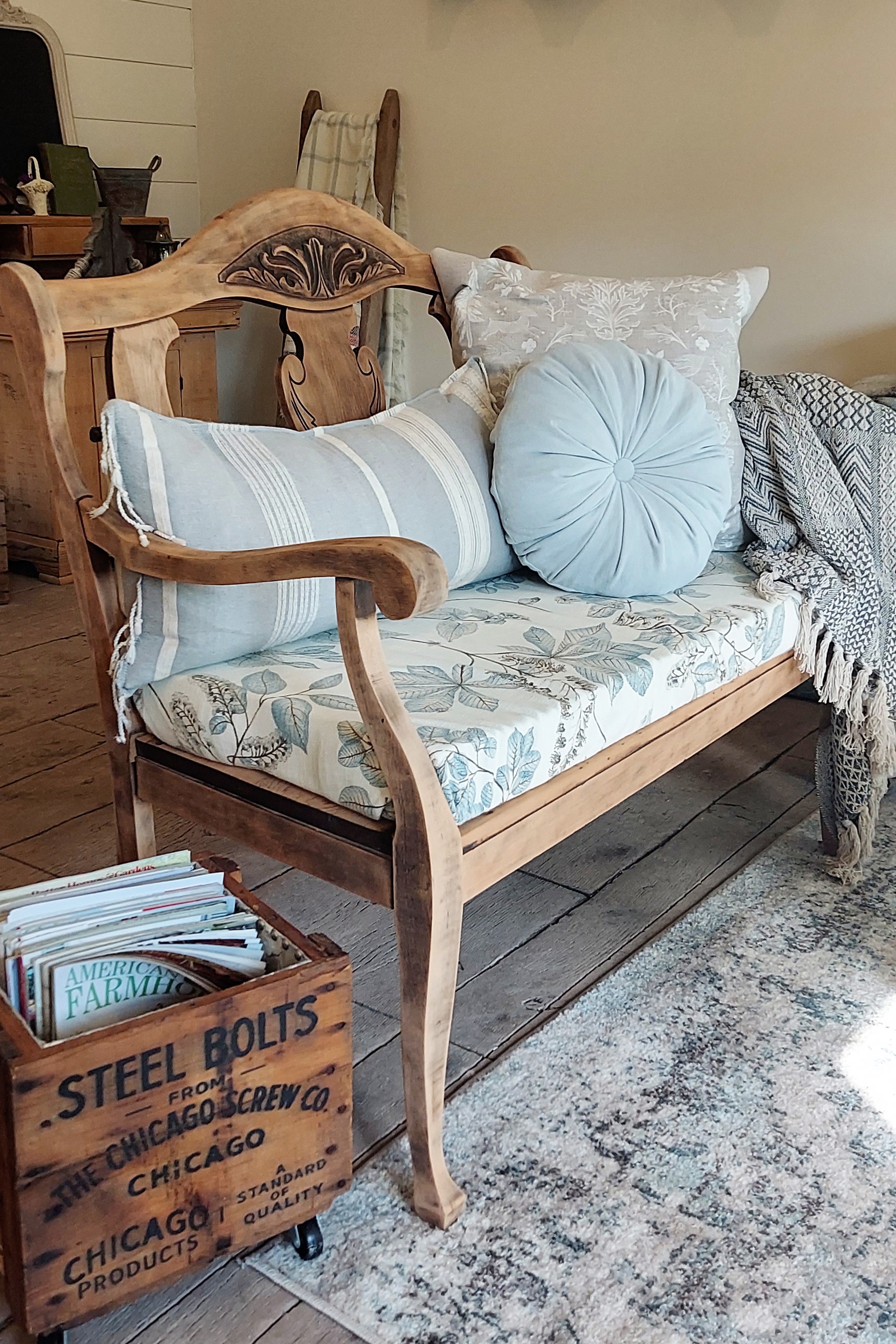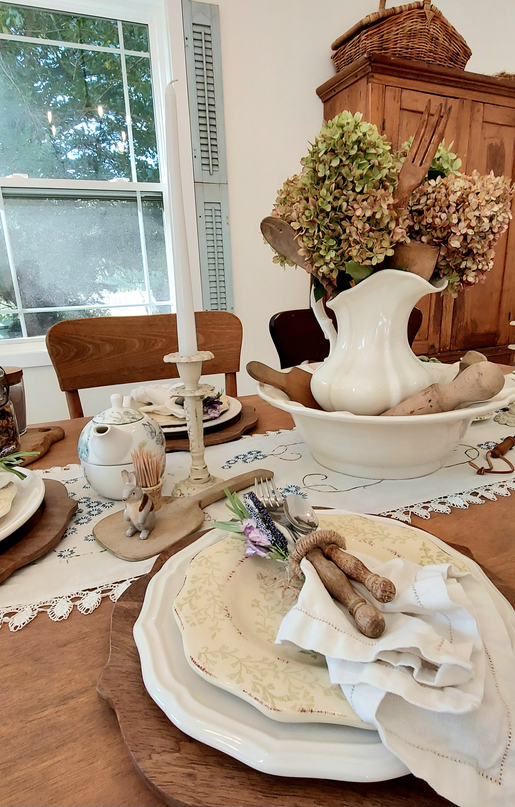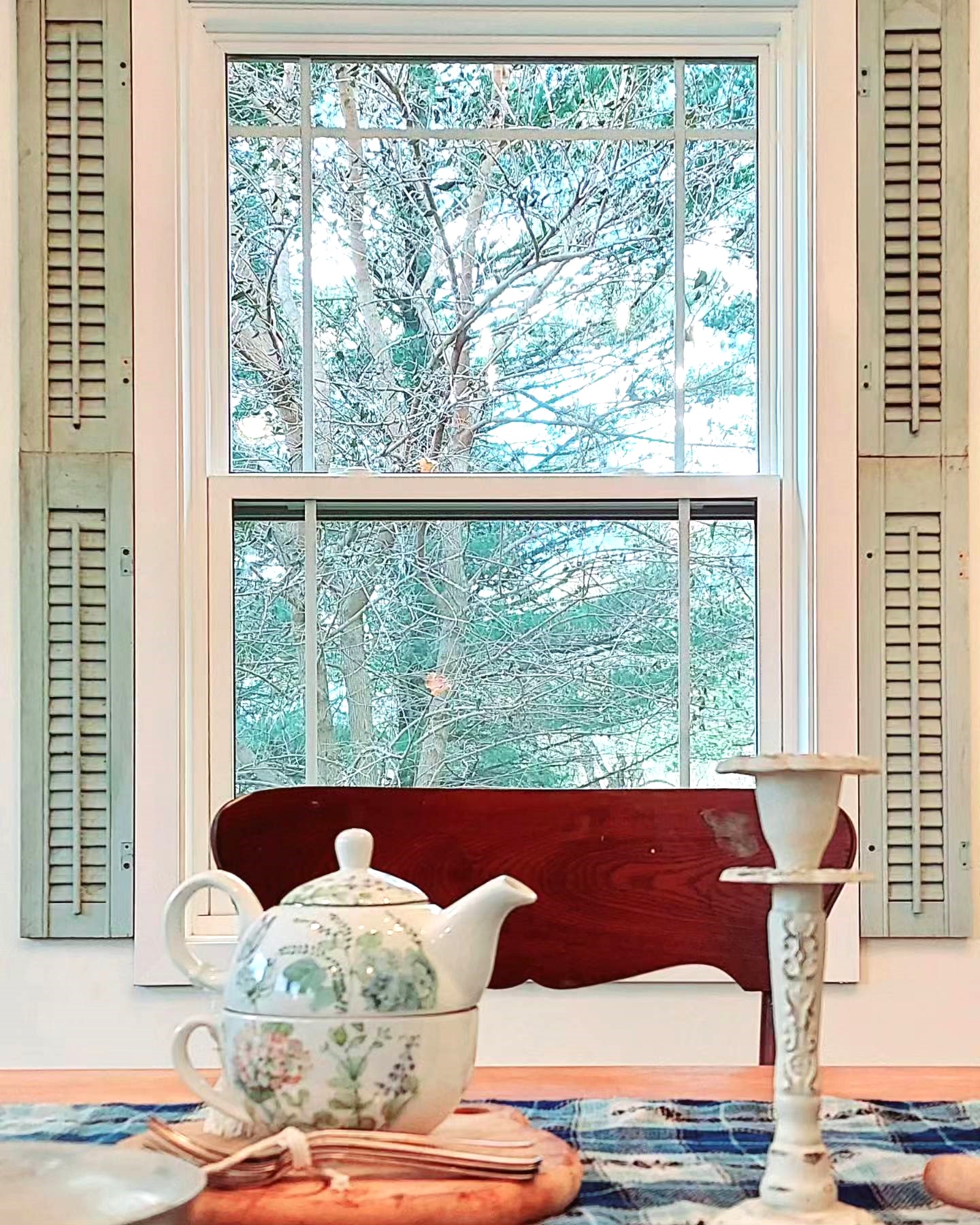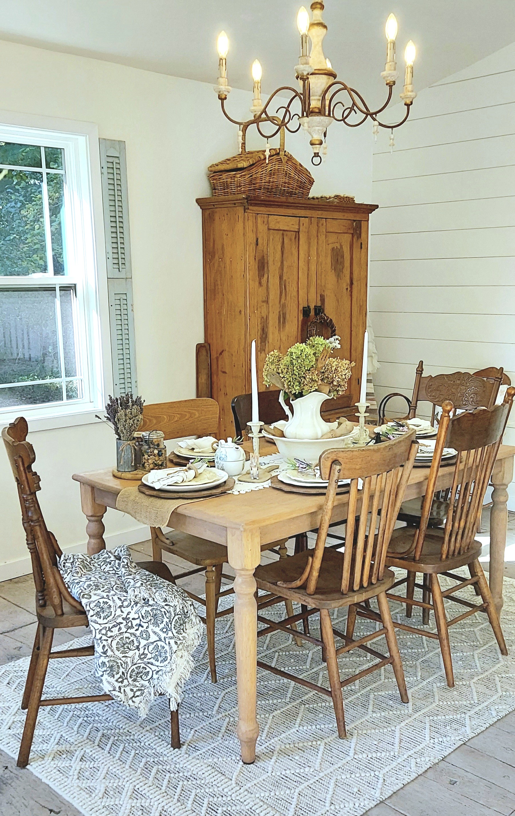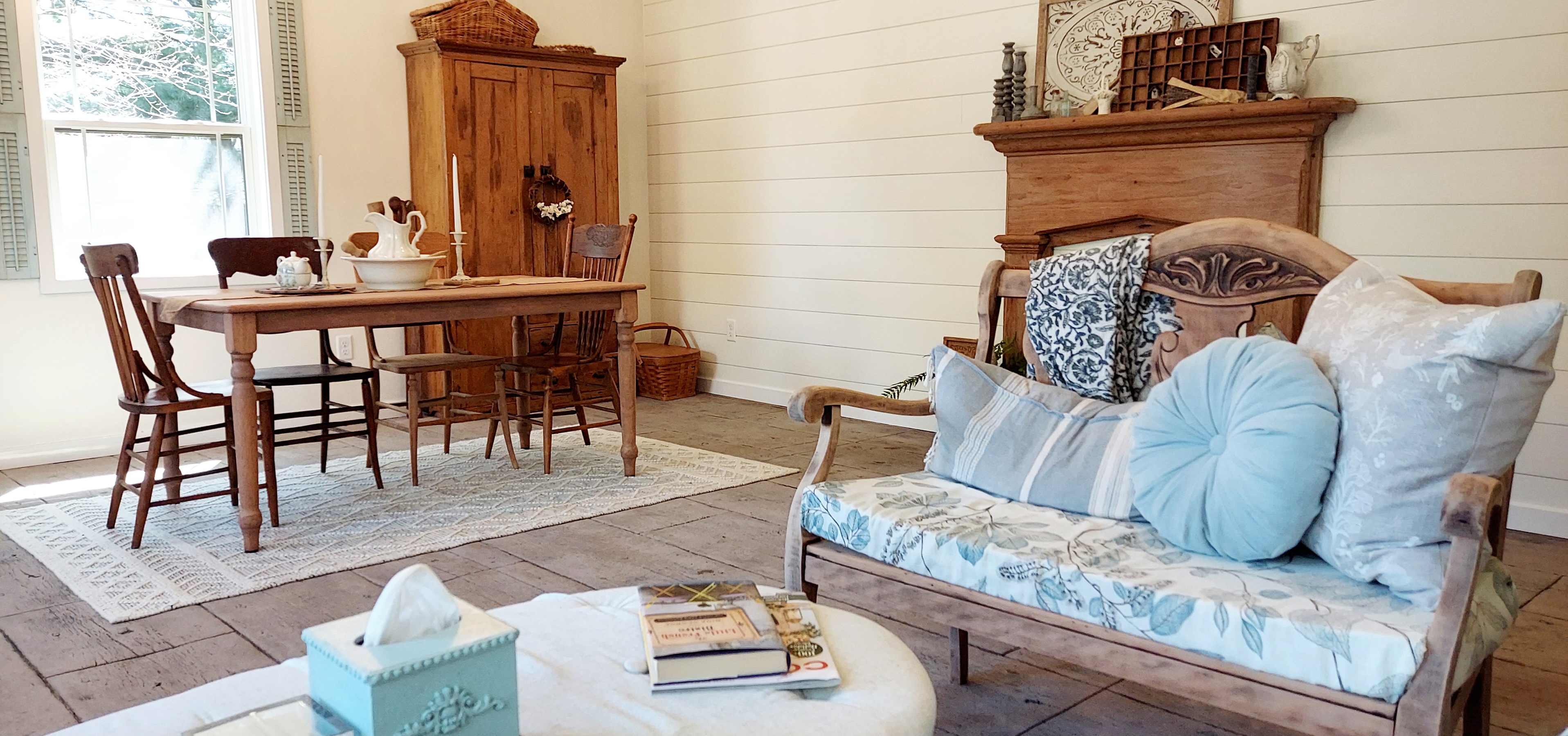 I refinished most items found on Marketplace, thrifted vintage treasures at local shops, and added to my collection over 3 years of family camping weekends during Covid. Some pieces like the daybed and pillows are new to fit my vision. The last piece of the puzzle was the primitive cabinet in the corner holding all my tableware and vintage china. It feels like it was meant to be here. But I secretly think the dusty blue window shutters will always be one of my favorite finds.